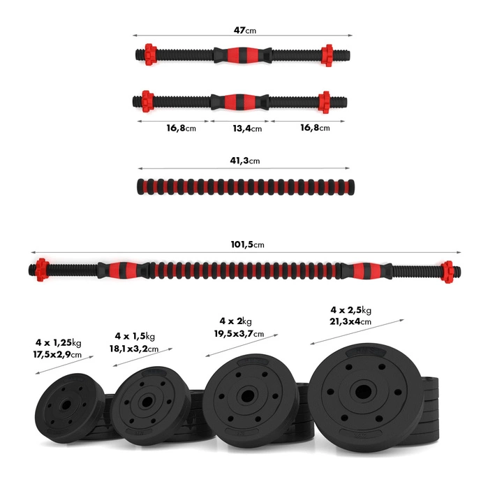 Kompaktowe wymiary krótkich gryfów (35 cm długości, 33 mm średnicy uchwytu) oraz łącznika (40 cm długości) sprawiają, że zestaw łatwo zmieści się w niewielkiej przestrzeni. Po skończonym treningu elementy możesz schować nawet w małej szafie, co czyni ten zestaw praktycznym wyborem do każdego mieszkania.