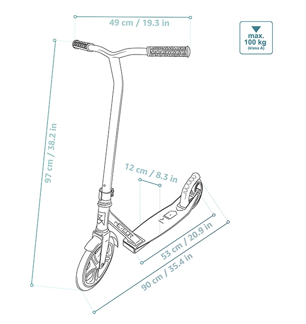 HULAJNOGA METEOR MEX to klasyczny model przeznaczony dla osób, których waga nie przekracza 100 kg. Prosta konstrukcja wykonana z aluminium charakteryzuje się lekkością i wytrzymałością. Trwałość połączeń poszczególnych elementów zapewniają stalowe śruby. Producent zdecydował się na maksymalne obniżenie podestu w celu ułatwienia jazdy początkującym użytkownikom. Wymiary podestu pokrytego antypoślizgową powłoką wynoszą 53x12 cm. Znakomity komfort jazdy zapewniają odporne na ścieranie poliuretanowe koła o średnicy 20 cm oraz nowoczesne i płynnie działające łożyska ABEC-7. Wysoki poziom bezpieczeństwa zapewnia hamulec nożny umieszczony na tylnym kole, pełniący również funkcję błotnika. Kierownica o wysokości 97 cm i szerokości 49 cm wyposażona została w gumowe rączki zapewniające pewny chwyt. Produkt oferowany przez producenta wykonano zgodnie z europejską normą PN-EN 14619:2019-11E. W skład zestawu poza hulajnogą wchodzą klucze do montażu. Sprzęt dostępny jest w różnych wariantach kolorystycznych