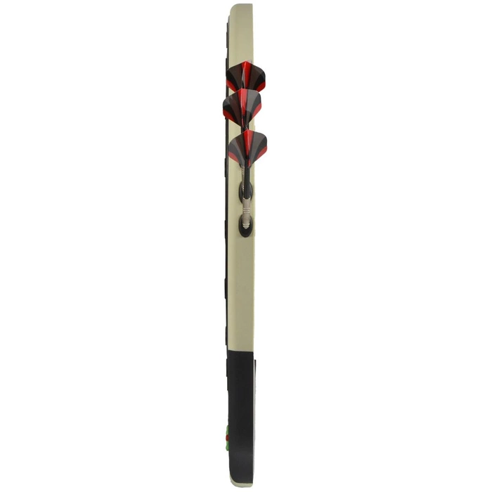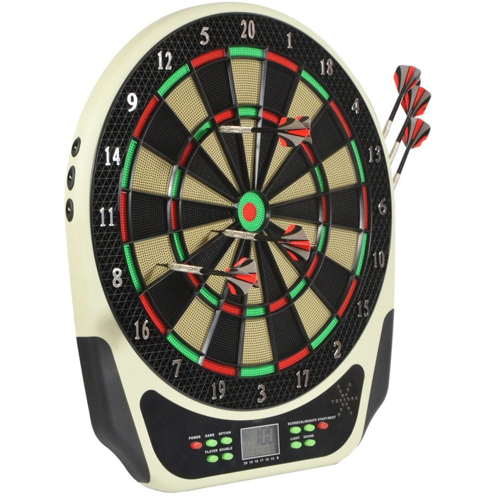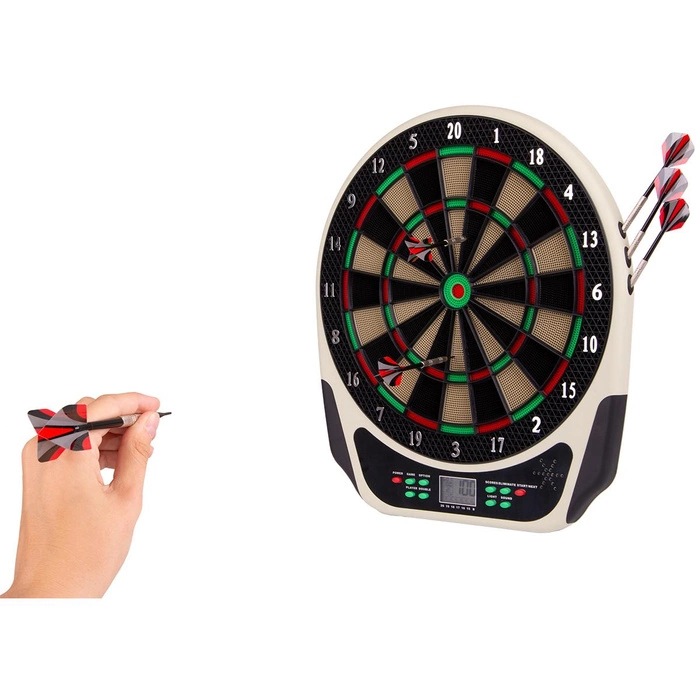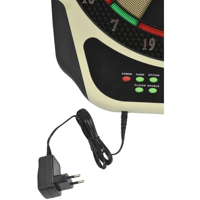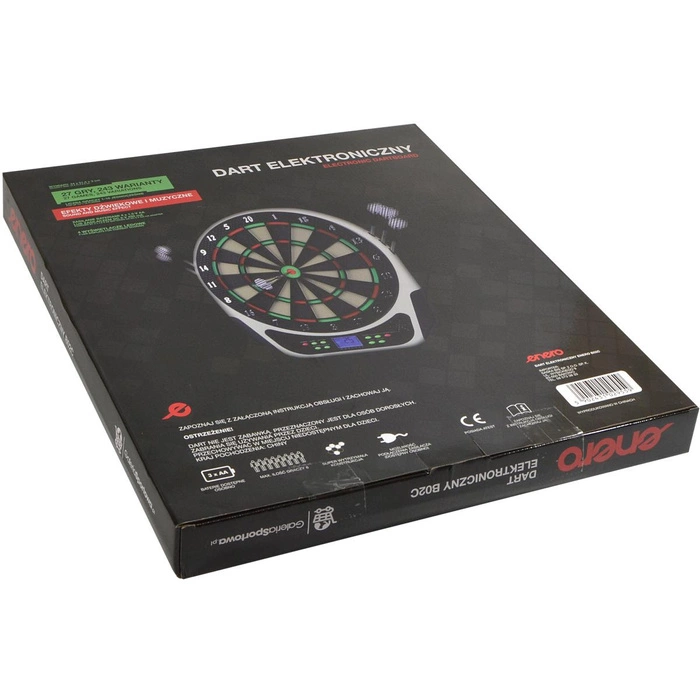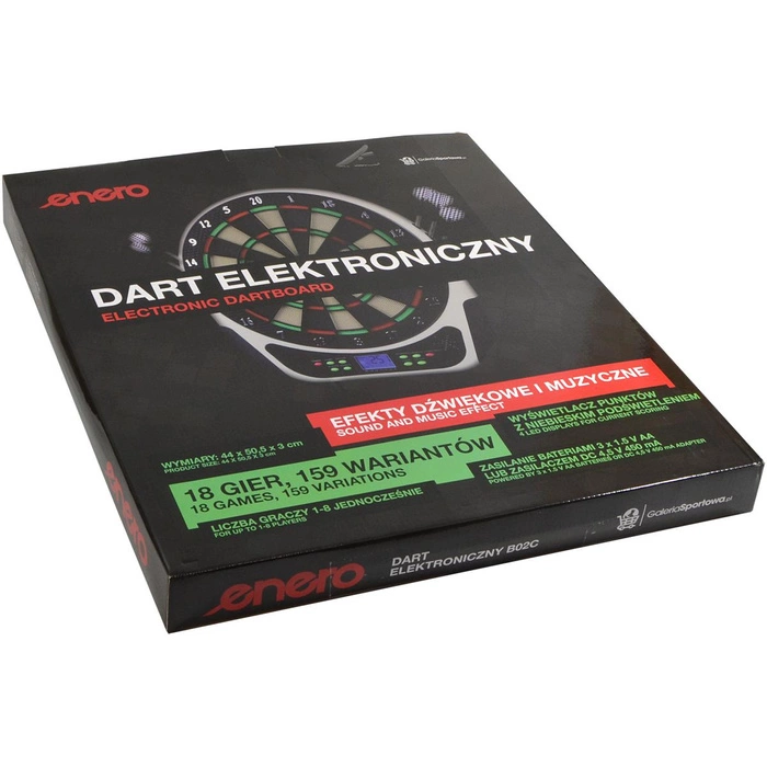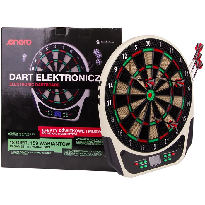 Dart Elektroniczny z zasilaczem Enero 50 cm to wysokiej jakości sprzęt wykonany z solidnych materiałów zasilany sieciowo lub za pomocą 3 baterii AA. Tarcza z tworzyw sztucznych ma średnicę 50 cm, a umieszczony w dolnej części wyświetlacz LED automatycznie zlicza i pokazuje punkty. W pamięci urządzenia zapisano 18 gier w 159 odmianach, z których może korzystać od 1 do 8 graczy o różnym poziomie zaawansowania. Sprzęt przeznaczony do użytku wewnętrznego. W skład zestawu poza tarczą, której waga wynosi 2,1 kg, znajduje się również zasilacz sieciowy oraz komplet 6 rzutek wraz z 6 zapasowymi końcówkami. Praktyczne otwory w tarczy ułatwiają przechowywanie rzutek. Urządzenie wyposażone zostało w sygnalizator głosowy i dźwiękowy oraz automatyczny wyłącznik, który odłącza zasilanie, gdy dart nie jest użytkowany przez 30 minut. Sprzęt charakteryzuje się dużą trwałością, a dołączona do zestawu instrukcja w języku polskim ułatwia korzystanie z zapisanych w pamięci gier. Produkt zapewnia doskonałą rozrywkę dla całej rodziny.