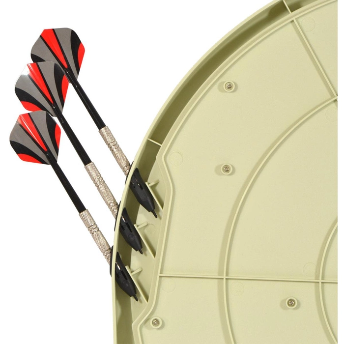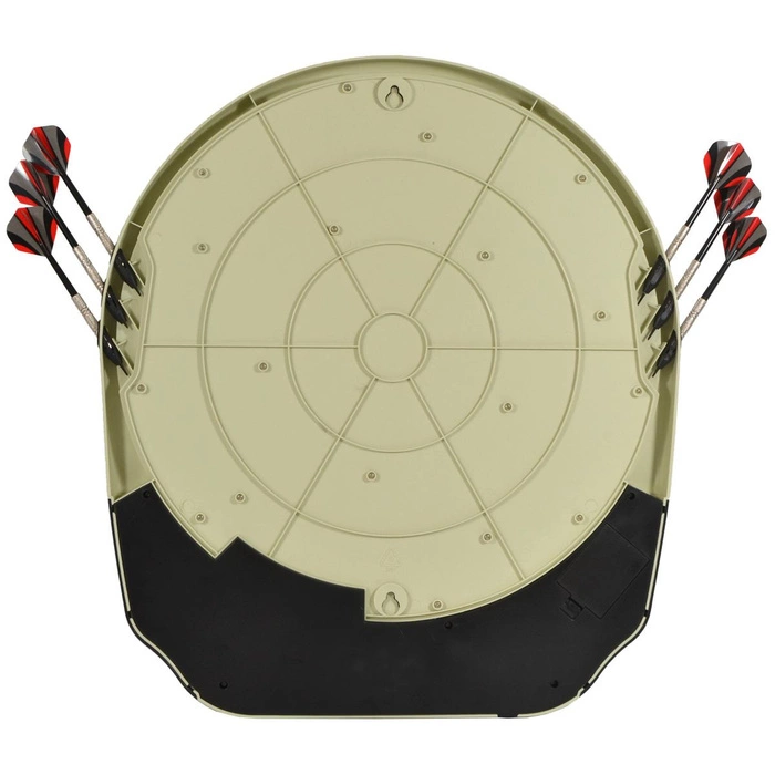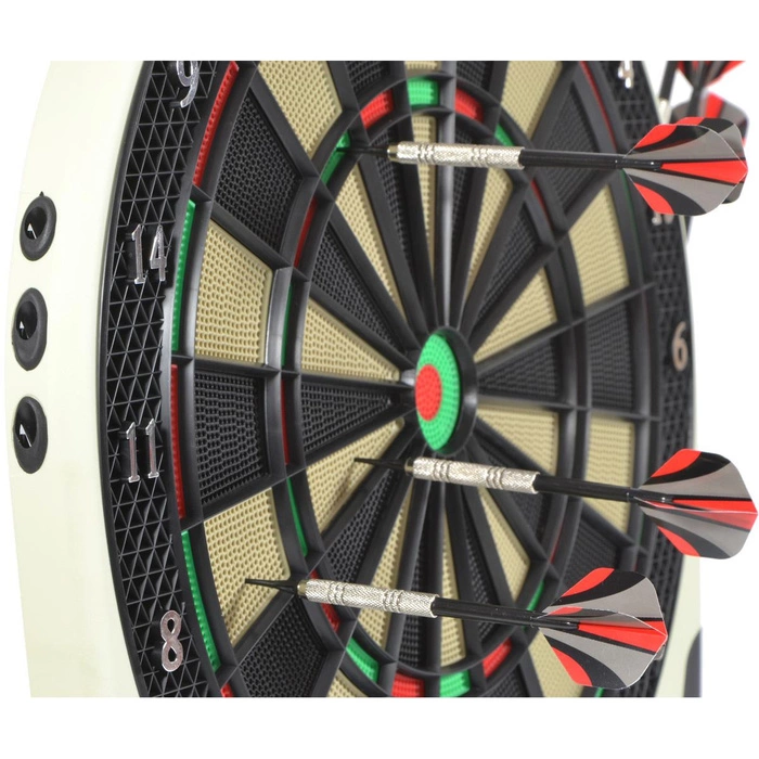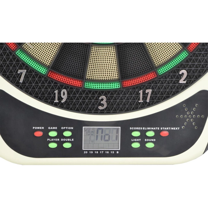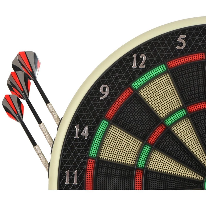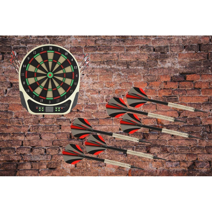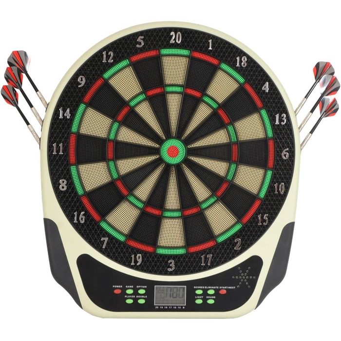 Dart Elektroniczny z zasilaczem Enero 50 cm to wysokiej jakości sprzęt wykonany z solidnych materiałów zasilany sieciowo lub za pomocą 3 baterii AA. Tarcza z tworzyw sztucznych ma średnicę 50 cm, a umieszczony w dolnej części wyświetlacz LED automatycznie zlicza i pokazuje punkty. W pamięci urządzenia zapisano 18 gier w 159 odmianach, z których może korzystać od 1 do 8 graczy o różnym poziomie zaawansowania. Sprzęt przeznaczony do użytku wewnętrznego. W skład zestawu poza tarczą, której waga wynosi 2,1 kg, znajduje się również zasilacz sieciowy oraz komplet 6 rzutek wraz z 6 zapasowymi końcówkami. Praktyczne otwory w tarczy ułatwiają przechowywanie rzutek. Urządzenie wyposażone zostało w sygnalizator głosowy i dźwiękowy oraz automatyczny wyłącznik, który odłącza zasilanie, gdy dart nie jest użytkowany przez 30 minut. Sprzęt charakteryzuje się dużą trwałością, a dołączona do zestawu instrukcja w języku polskim ułatwia korzystanie z zapisanych w pamięci gier. Produkt zapewnia doskonałą rozrywkę dla całej rodziny.
