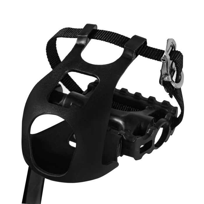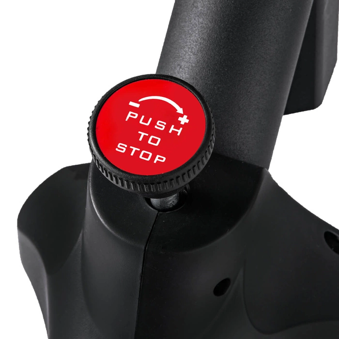 Na ramie umieszczona jest gałka, za pomocą której możesz stopniować obciążenie. Jeżeli potrzebujesz zatrzymać się, wystarczy że ją wciśniesz i koło przestanie się obracać. Prostota tego mechanizmu zapewnia maksymalne bezpieczeństwo w trakcie jazdy. Na pedałach znajdują się regulowane koszyki kolarskie. Dzięki temu podczas jazdy pracuje większa ilość mięśni.