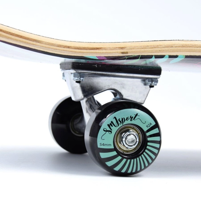 Deskorolka marki SJM sport została wyposażona w podwójny kick-tail. Deck ma 7 warstw, jest profilowany, a jego długość wynosi 79 cm. Koła wykonane z PU wykazują twardość na poziomie 92A, dzięki czemu pozwalają na rozwinięcie dużych prędkości, wytrzymując jednocześnie twarde lądowanie. Waga użytkownika nie powinna przekraczać jednak 100 kg. Aluminiowe traki zapewniają optymalną kontrolę podczas różnego rodzaju akrobacji oraz manewrów, łożyska ABEC-5 gwarantują świetny poślizg i komfortowe użytkowanie.