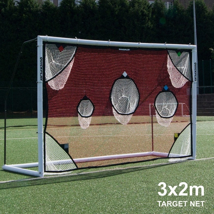 Siatki celownicze to must have dla każdego piłkarza. Pozwolą wam na rozwój celności waszych kopnięć jak i sposobu podejścia do piłki. Będziesz mógł się nauczyć, jak ustawić odpowiednio stopę, żeby poprowadzić piłkę, dokładnie tam gdzie chcesz. Idealnie nadają się, do pojedynczego treningu, lub łączonego z wykorzystaniem innych akcesoriów treningowych takich jak słupki, lub opony. Wykonane są z najwyższej jakości materiałów. Siatki celownicze Quickplay mają dociążony spód, dzięki czemu zachowują sztywną napiętą strukturę. Taka siatka pozwala na odbicie nadlatującej piłki, jeśli nie traficie w odpowiednią komorę. Pozwoli wam to na szybszy trening i mniejsze marnowanie czasu. Wszystkie siatki niezależnie od rozmiaru wyposażone są w 7 komór. Po jednej w każdym okienku i trzy w centrum siatki. Do każdej komory dodany jest kolorowy znacznik. Dzięki temu wasz trener lub znajomy będzie w stanie szybko informować, gdzie macie pokierować piłkę. Jeśli chcesz rozwinąć swoją celność, to siatka celownicza jest idealnym wyborem.
