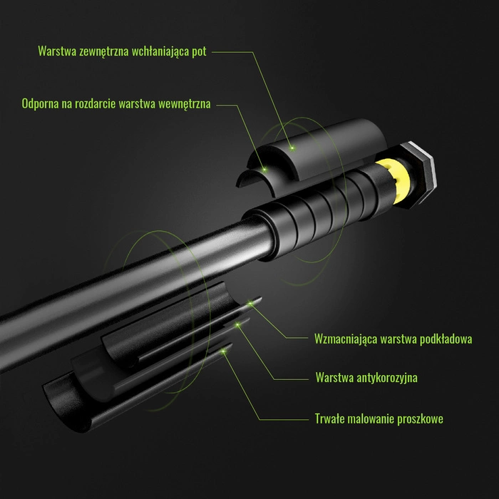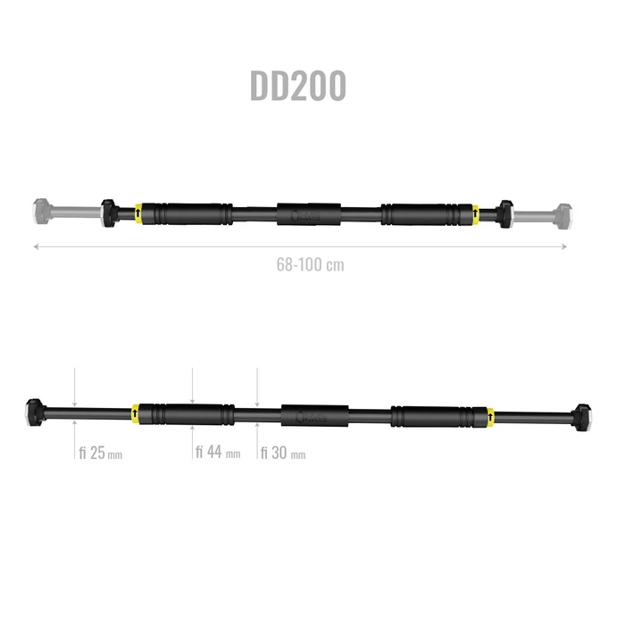 Drążek rozporowy DD200 został wyposażony w specjalne uchwyty wykonane z pianki EVA, które nie tylko poprawiają komfort podczas ćwiczeń, ale także zapobiegają ślizganiu się dłoni nawet podczas intensywnych treningów. Silikonowe podkładki na końcach drążka zapewniają pewne i stabilne zamocowanie, chroniąc jednocześnie powierzchnię ścian i futryn przed uszkodzeniem. Dzięki temu możesz bez obaw korzystać z drążka nawet w wynajmowanym mieszkaniu czy nowo wyremontowanym domu.