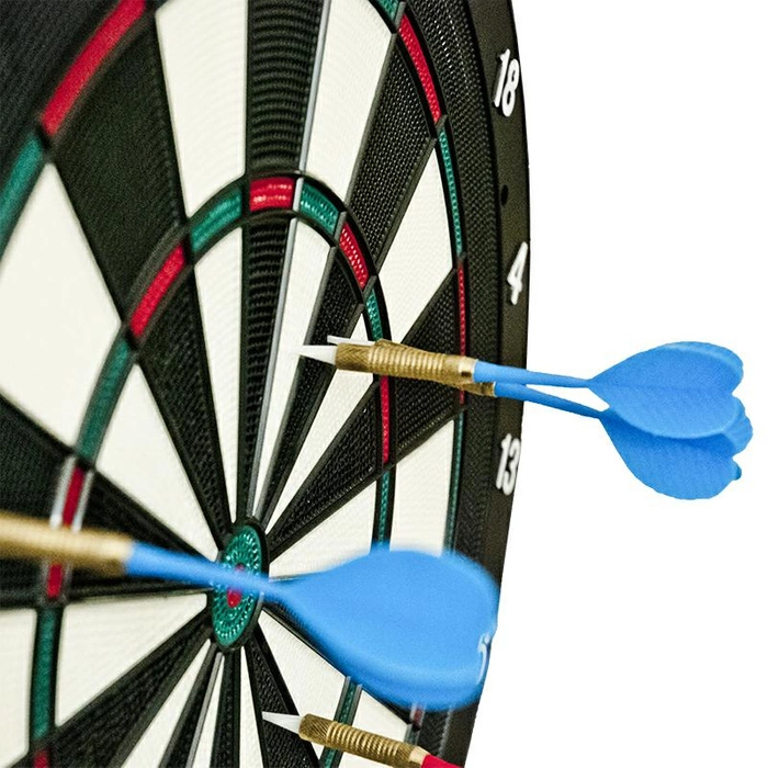 Wysokiej jakości tarcza do darta, idealna dla średnio zaawansowanych i początkujących zawodników. Zawartość opakowania to tarcza (o średnicy 18") wykonana z tworzywa sztucznego wraz z zestawem sześciu rzutek typu SOFTTIP (grot z tworzywa sztucznego). Tarcza posiada uchwyt do zawieszenia. Materiał: tarcza - tworzywo sztuczne; rzutki - tworzywo sztuczne Rozmiar tarczy: 18”