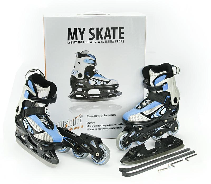 ŁYŻWY HOKEJOWE MY SKATE NIEBIESKIE to innowacyjny produkt, który może być wykorzystywany o każdej porze roku. Cechą wyróżniającą ten model jest wymienna płoza, która pozwala w prosty sposób zamienić łyżwy w rolki. Cała konstrukcja charakteryzuje się lekkością, wytrzymałością i estetycznym wyglądem. Półmiękki but wykonany został z poliuretanu i wzmocniony polipropylenowymi wstawkami. Do wytworzenia podeszwy producent użył wzmocnionego plastiku. But wyposażony został w potrójny system wiązania za pomocą klamry, sznurowadeł oraz paska. Umieszczona we wnętrzu buta wkładka z mikrofibry dopasowuje się do kształtu stopy, zapewniając odpowiedni komfort i zabezpieczając stopy przed nadmiernym poceniem. Płozę łyżwy wykonano z lekkiej i wytrzymałej stali węglowej, a płozę rolek z polipropylenu. Zamocowane do niej poliuretanowe kółka gwarantują wysoki komfort jazdy, a łożyska ABEC-5 generują niewielkie opory toczenia. Produkt oferowany przez cenionego producenta sprzętu sportowego dostępny jest w różnych rozmiarach.