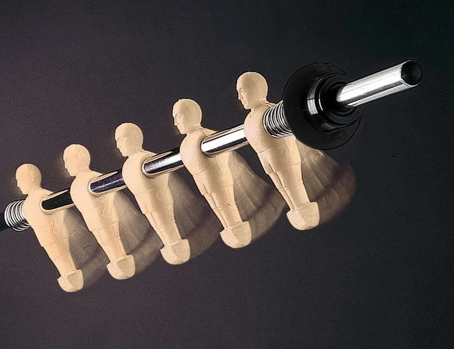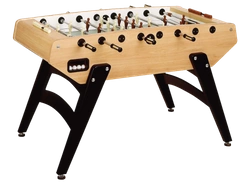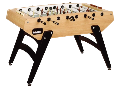 STÓŁ PIŁKARZYKI G5000 o długości 150cm i szerokości 76cm. Dzięki możliwości regulacji nóg stół można ustawić na wysokość w przedziale 89-92cm. Skośne nogi, kolorystyka i kształt poszczególnych elementów sprawiają, że stół prezentuje się ekskluzywnie i nowocześnie. Dzięki temu oprócz dostarczania rozrywki może z powodzeniem służyć jako stylowa ozdoba pomieszczenia. Stół wykonany jest z 3-centymetrowej drewnianej sklejki, która dodatkowo pokryta została laminatem z tworzywa sztucznego. Nogi wykonane z drewna bukowego o grubości 4cm sprawiają, że konstrukcja jest wytrzymała i stabilna. Pole gry o wymiarach 120x70cm zostało pokryte szkłem piaskowanym, co pozwala piłce na płynne poruszanie się. Wyścielone filcem bramki redukują hałas podczas gry. Stół posiada europejski certyfikat bezpieczeństwa. Do wyboru mamy stół z osiami teleskopowymi i przelotowymi.Waga całego zestawu wynosi 78kg. Zestaw zawiera 10 piłeczek do gry.