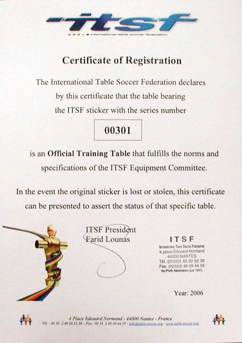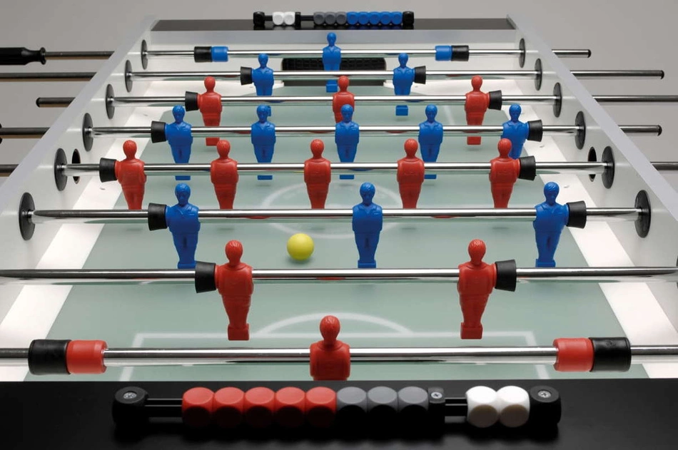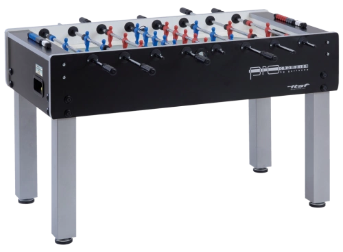 Oficjalny stół treningowy licencjonowany przez Federację ITSF już jest w zasięgu Twojej ręki! Piłkarzyki to kultowa gra, a firma Garlando zapewnia ten gustowny, elegancki i stabilny stół do zabawy oraz poważnych rozgrywek. Sprawdzi się świetnie wśród profesjonalnych graczy, a certyfikat dopuszcza do międzynarodowych rozgrywek rangi ITSF PRO TOUR. Gra na tym stole to sama przyjemność. Antyrefleksyjna piaskowa szyba znajdująca się na polu gry uniemożliwia odbijanie się światła, a kulkowe łożyska precyzyjnie kierują drążki nie męcząc jednocześnie nadgarstków graczy. Dodatkowo metalowe nogi posiadają funkcję regulacji, dzięki czemu gracze mogą wyregulować jego wysokość. Samo wykonanie figurek piłkarzyków jest na wysokim poziomie. Odlane bezpośrednio na drążkach z moplenu sprawia, że piłkarzyki nie ruszają się nawet przy mocnych uderzeniach. Bramkarz posiada możliwość obrotu o 360 stopni co pozwala na zachowanie jeszcze większej kontroli nad grą. Dla zachowania porządku w grze na stole znajduje się licznik goli, gemów oraz setów.