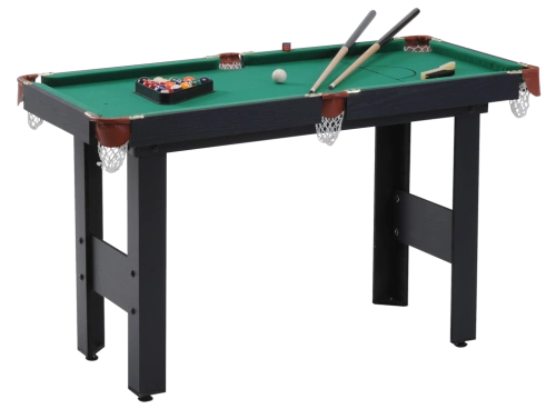 Stół bilardowy Dallas o wymiarach 120x65x79 to doskonały pomysł na spędzanie wolnego czasu. Posiada on regulowane nogi, dzięki czemu można go dostosować nawet do tych mniejszych użytkowników. Nogi wykonane są z 12-milimetrówej płyty MDF, przez co są bardziej stabilne i wytrzymałe. Dodatkowo dla lepszej stabilności i wzmocnienia zastosowano poziome elementy łączące nogi stołu. Blat stołu o grubości 12mm pokryty jest zielonym suknem, a materiał, z jakiego został wykonany to drewno. Dzięki temu jest on bardziej wytrzymały i odporny na czynniki zewnętrzne. Gumowe krawędzie łuz gwarantują właściwe odbicie bil i zwiększają komfort gry. Kosze na bile wpadające do łuz są sznurowane, dzięki czemu od razu widać gdzie znajdują się wbite bile po skończonej grze. Stół waży zaledwie 20 kilogramów, a jego przemyślana konstrukcja pozwala na szybkie i swobodne przenoszenie i chowanie. Zestaw zawiera komplet bil o średnicy 38-milimetrów, 2 drewniane kije o długości 107cm, 2 kredy trójkąt do ustawiania bil na stole oraz szczotkę do czyszczenia sukna na blacie.