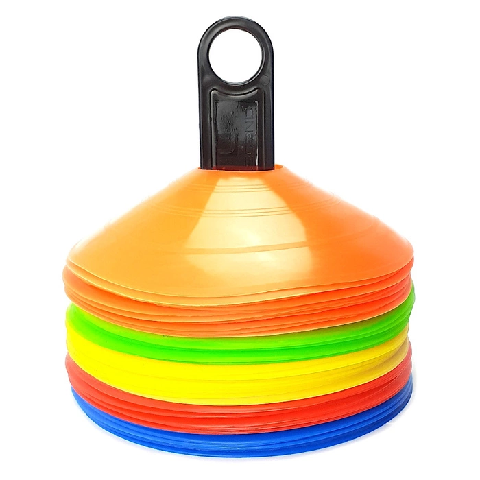 Zestaw 50 stożków treningowych (talerzyków) to praktyczne wyposażenie do treningów sportowych, zajęć WF i rekreacji.
