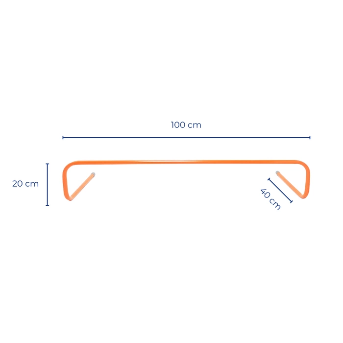 Wykonany z rurki metalowej o średnicy 18 mm płotek treningowy samoczynnie powracający do pozycji wyjściowej. Płotek wysokości 20 cm. Pozostałe wymiary: szerokość 100 cm, głębokość 40 cm.