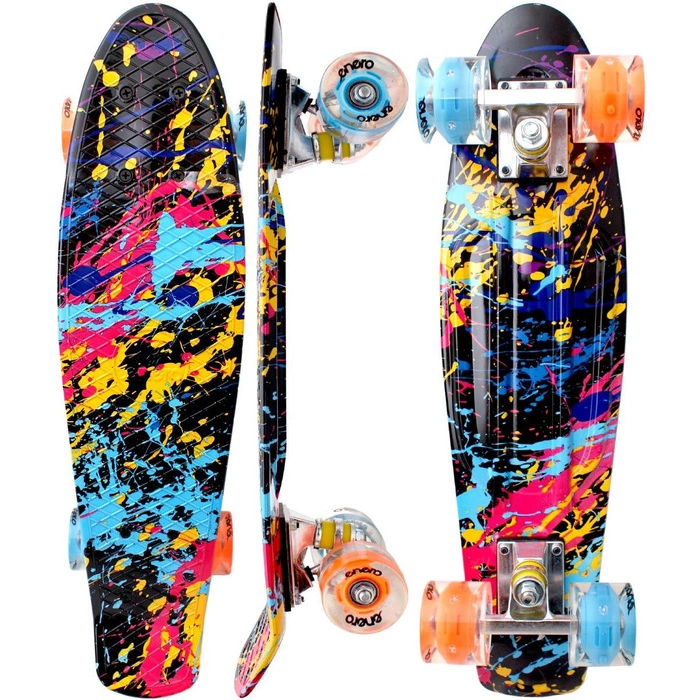 Kółka deskorolki zostały wykonane z PU, posiadają łożyska ABEC7. Ich atrakcyjność zwiększają lampy LED o wymiarach: 60 x 45 mm. Oświetlenie poprawia także poziom bezpieczeństwa na drodze. Kółka nie tylko zapewniają płynną jazdę, ale są również odporne na uszkodzenia i ścieranie. Maksymalna waga użytkownika nie powinna przekraczać 80 kg. Deskorolka wyróżnia się atrakcyjnym designem, którym jest wielokolorowe graffiti