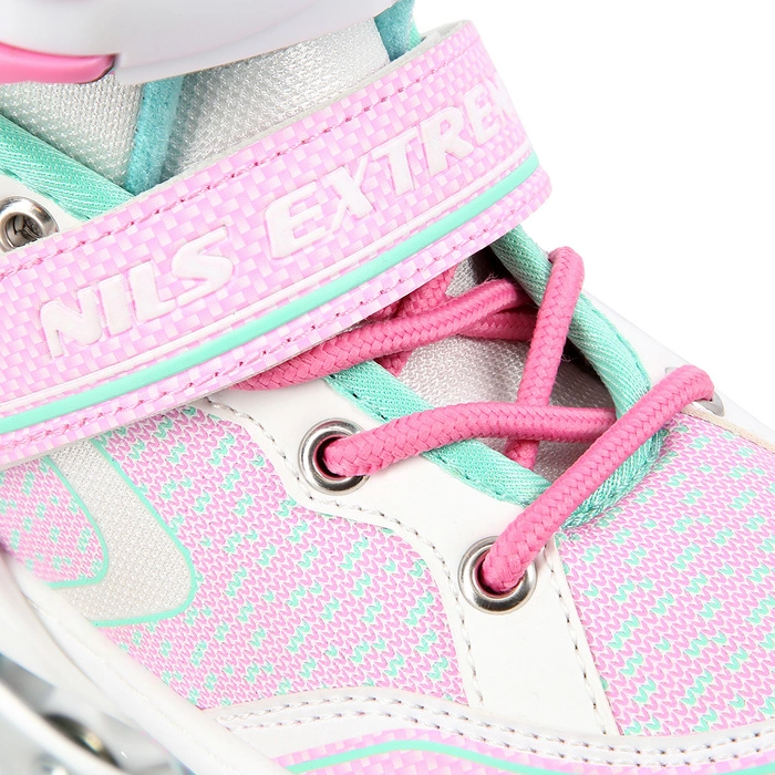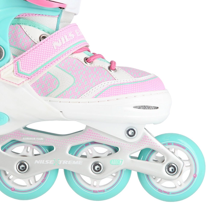 NA14198 ŁYŻWOROLKI NILS EXTREME to łyżworolki przeznaczone dla początkujących i średniozaawansowanych użytkowników. Model cechuje połączenie wysokiej jakości materiałów z ciekawym wzornictwem, umieszczonym w sprzęcie o klasycznym wyglądzie. Model zapewnia bardzo duży komfort użytkowania, a możliwa regulacja rozmiarów pozwoli korzystać z łyżworolek więcej niż 1 sezon. Przy produkcji buta wykorzystano syntetyczną skórę wraz z materiałem EVA, siatkę mesh oraz piankę o dużej gęstości. Pozwoliło to stworzyć komfortowego, wytrzymałego i jednocześnie wentylowanego buta, który zapewni wiele godzin wygodnej jazdy. But jest zapinany za pomocą dwusekcyjnej klamry, sznurowadeł oraz rzepa. Miękkie i absorbujące drobne nierówności kółka, umieszczono na łożyskach klasy ABEC7. Kółka z PU mają wielkość dostosowaną do rozmiaru buta, a zamontowany w łyżworolkach hamulec jest odporny na uderzenia i pozwoli na skuteczne hamowanie nawet przy dużej prędkości.
