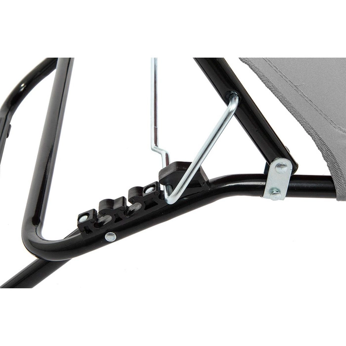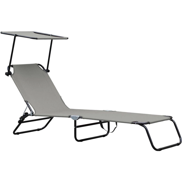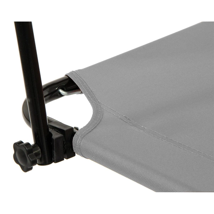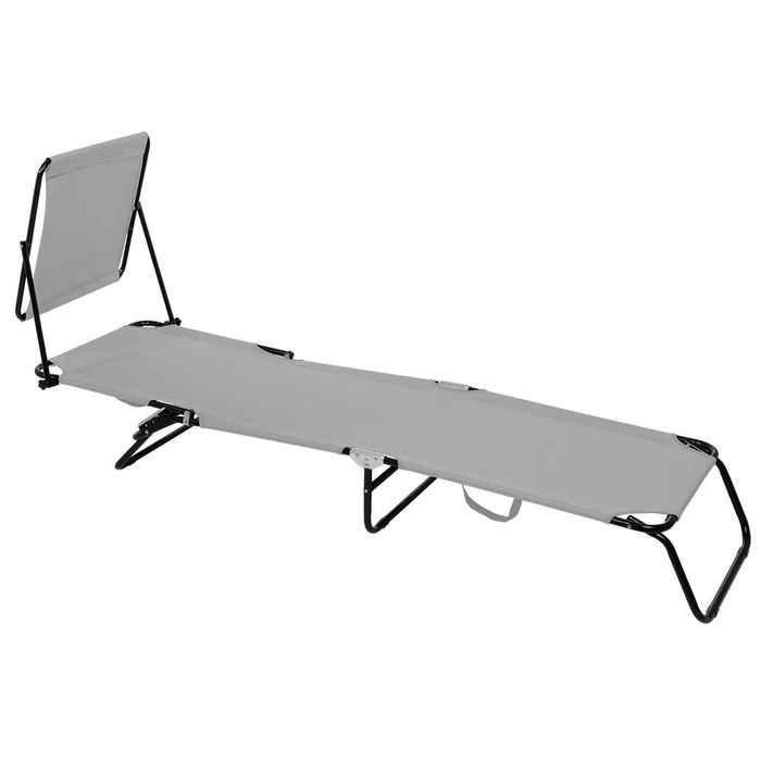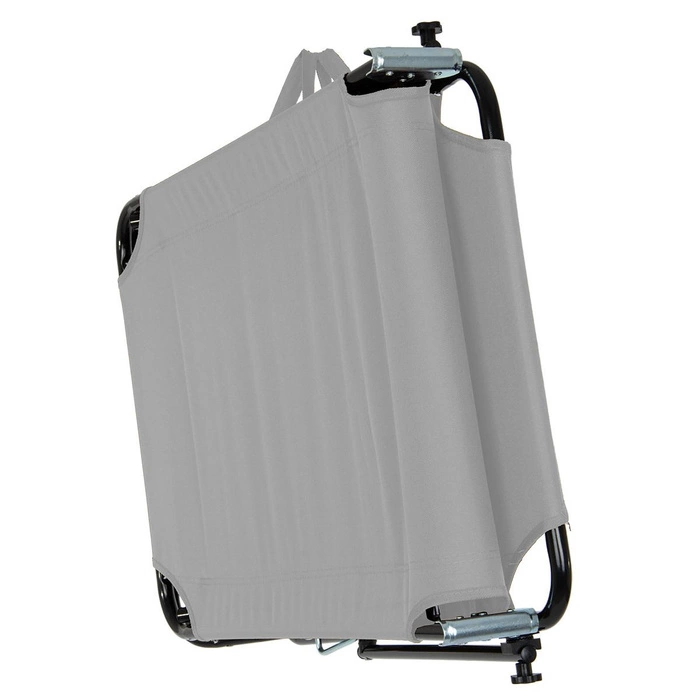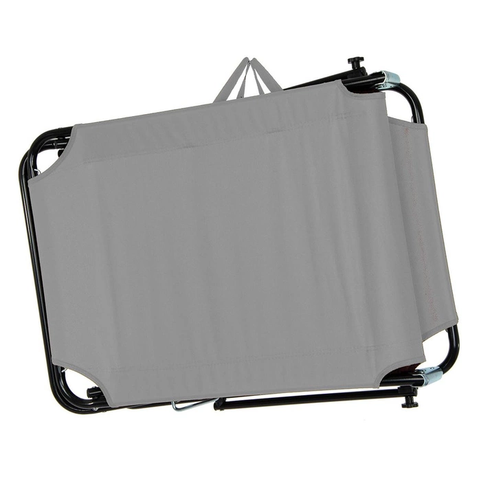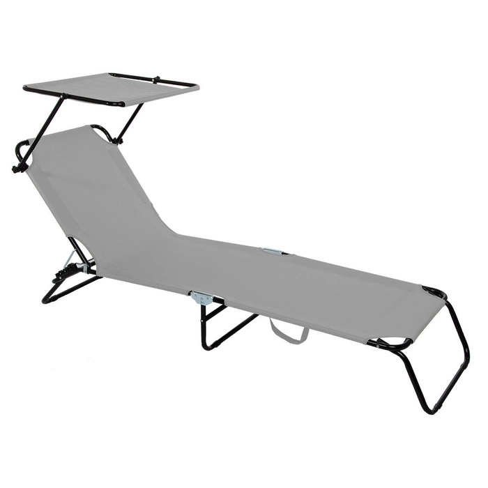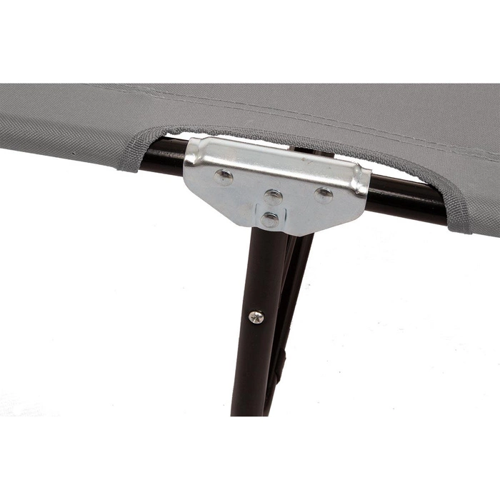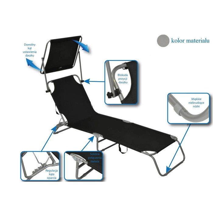 Łóżko kempingowe wyposażone w daszek chroniący przed słońcem. Rama jest kolorze srebrnym wykonana ze stali. Średnica rurki wynosi 18 mm, a grubość jej ścianki 0,9 mm. Siedlisko jest wykonane z materiału 600D oxford. Jest to wytrzymała i wodoodporna tkanina poliestrowa, miękka w dotyku i łatwa do czyszczenia. Dostępne są kolory brązowy, czarny i szary. Łóżko można ustawić w trzech różnych pozycjach, od leżącej do półsiedzącej. Daszek jest regulowany, dzięki jest możliwe dostosowanie go do indywidualnych potrzeb i preferencji. Długość łóżka wynosi 186 cm, a szerokość 54 cm. Wysokość zawiera się w przedziale 24 cm - 79 cm. Zależy ona zarówno od ustawienia samego łóżka, jak i daszka. Ważnymi zaletami są możliwość złożenia łóżka i mała masa, tj. 4,5 kg. Dzięki temu jest ono łatwe w transporcie. Ponadto jest wyposażone w miękkie niebrudzące nóżki, jest stabilne i ma wytrzymałość do 100 kg.
