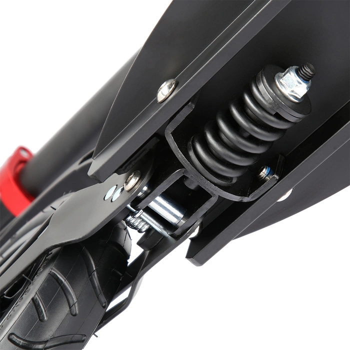Cechą charakterystyczną tego produktu, jest bardzo duże przednie koło i tylny, poziomy amortyzator. Takie połączenie, zapewnia rewelacyjny komfort podczas jazdy, minimalizuje drgania oraz pochłaniają wstrząsy. Dzięki średnicy przedniego koła, produkt bardzo dobrze sprawdzi się, podczas przemieszczania po nierównych powierzchniach. Pozwala to również, na sprawne manewrowanie hulajnogą. Ponad to, koła są pompowane, co znacznie poszerza horyzonty, względem nawierzchni po której możemy się przemieszczać.