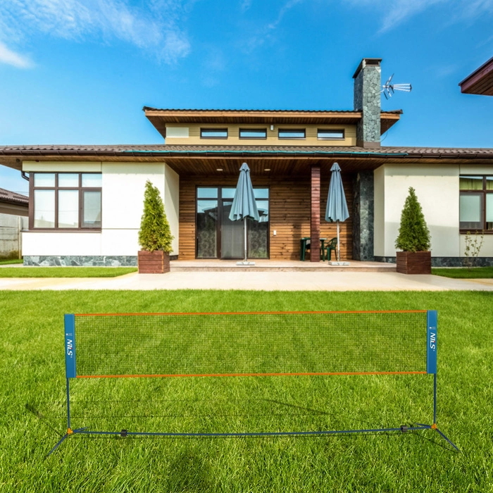 Siatka ma 4 metry długości i 1,55 metra wysokości, co czyni ją odpowiednią do amatorskich rozgrywek. Wykonana została z trwałego poliestru, odpornego na warunki atmosferyczne, dzięki czemu doskonale sprawdza się w plenerze – na podwórku, plaży czy w parku. Stelaż z solidnych, stalowych rur o wymiarach 19 × 1,2 mm zapewnia stabilność i długą żywotność konstrukcji. Dodatkowa poprzeczka środkowa zwiększa sztywność całego zestawu, chroniąc go przed przechylaniem i odkształceniem.