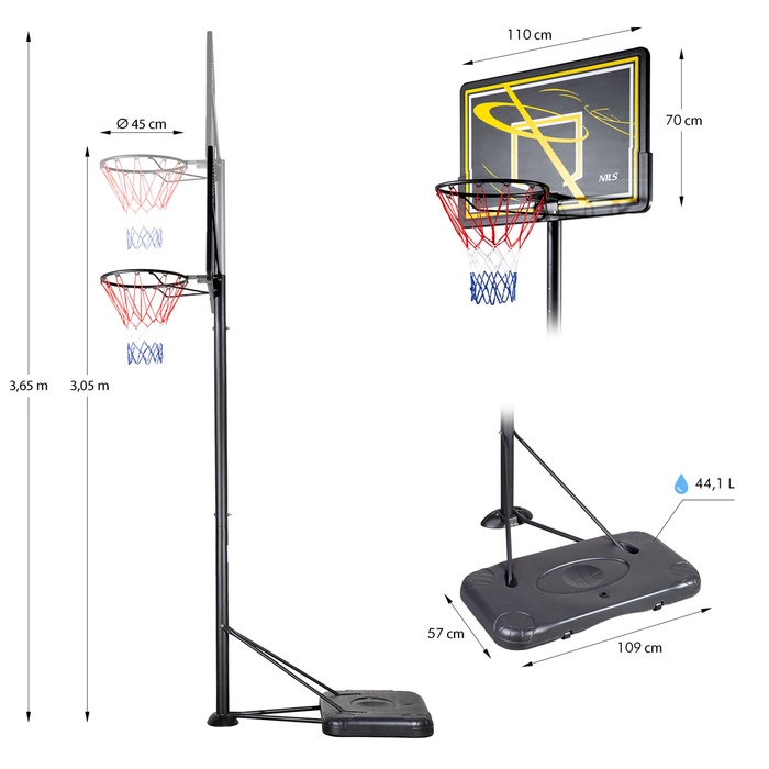 ZDK019E Kosz do koszykówki Nils jest mobilnym wolnostojącym koszem idealnym zarówno do treningu jak i do rozegrania meczu. Posiada 7 poziomów regulacji wysokości obręczy od 2,45 do 3,05 m, co pozwoli na korzystanie z niego każdemu niezależnie od wzrostu i doświadczenia. Tablica oraz podstawa kosza wykonane z polietylenu, stalowa obręcz i siatka z nylonu dają gwarancję długoletniego użytkowania i odporności na warunki atmosferyczne. Mobilność kosza zapewniają rolki transportowe zamontowane w jego podstawie.