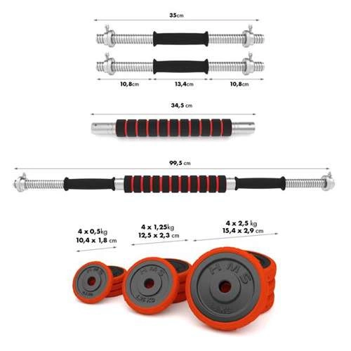 Zestaw zawiera dwa krótkie gryfy, łącznik do stworzenia sztangi oraz bogaty wybór talerzy (2,5 kg, 1,25 kg i 0,5 kg), co pozwala na precyzyjne dopasowanie obciążenia do aktualnych potrzeb. Taka konstrukcja umożliwia nie tylko trening z klasycznymi hantlami, ale także szybkie przekształcenie ich w jedną sztangę, co sprawdzi się podczas ćwiczeń wielostawowych – na przykład przysiadów, wyciskania leżąc czy martwego ciągu. W praktyce oznacza to, że możesz rano wykorzystać hantle do ćwiczeń izolowanych, a wieczorem, łącząc gryfy, przeprowadzić trening ogólnorozwojowy z użyciem sztangi. Dzięki temu oszczędzasz miejsce i pieniądze, a jednocześnie zyskujesz możliwość kompleksowego rozwoju siły i wytrzymałości.