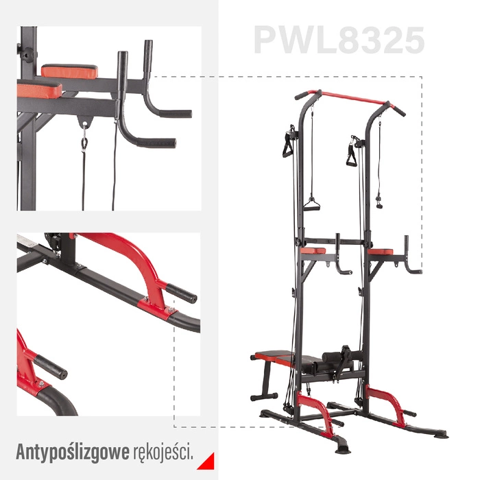 Poręcz HMS PWL8325 została wyposażona w wygodne siedzisko oraz oparcie pokryte antypoślizgową tapicerką, odporną na wilgoć i przetarcia. Takie rozwiązanie zapewnia komfort nawet podczas dłuższych sesji treningowych. Dodatkowo, miękkie pianki na rękojeściach gwarantują pewny chwyt podczas wykonywania ćwiczeń takich jak dipy, podciąganie czy pompki. W praktyce oznacza to, że możesz skoncentrować się na technice i powtórzeniach, bez ryzyka poślizgnięcia się czy dyskomfortu. To szczególnie ważne podczas treningów obwodowych, gdzie szybkie przechodzenie między ćwiczeniami wymaga niezawodności sprzętu.