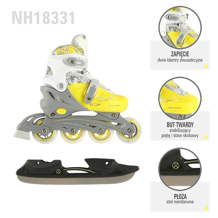 Łyżworolki z wym. płozą NILS EXTREME NH18331 4w1 to innowacyjny sprzęt, który może pełnić funkcję łyżworolek, łyżew, wrotek lub rolko-wrotek. Charakterystyczną cechą tego modelu jest twardy but wykonany z wytrzymałego polipropylenu. Odpowiednią stabilność stopy zapewniają dwie klamry dwusekcyjne. Oddychająca wkładka umieszczona we wnętrzu zapobiega nadmiernemu poceniu się stóp. Czterostopniowa regulacja rozmiaru pozwala dostosować sprzęt do potrzeb użytkownika. Produkt dostępny w różnych rozmiarach i kolorach.