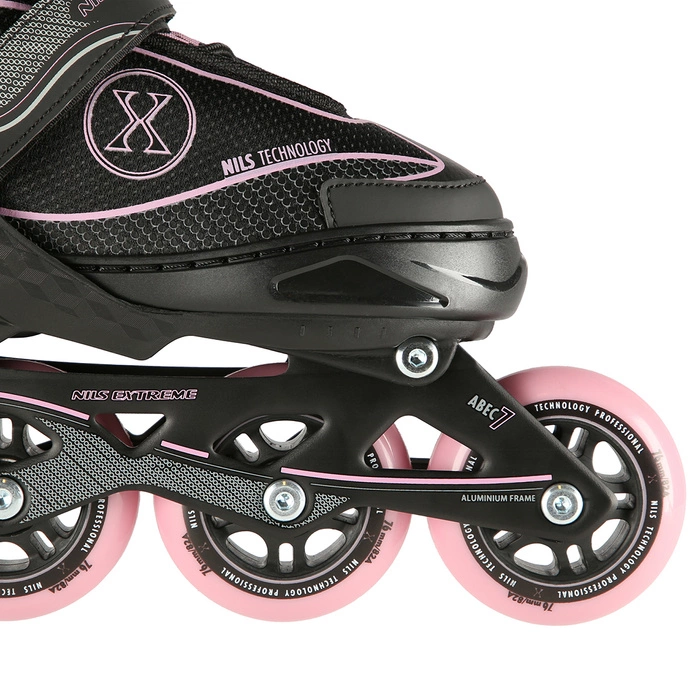 Jazda na łyżworolkach pozwala na aktywne spędzanie czasu, w przyjemny i ciekawy sposób. Łyżworolki NILS EXTREME NA11008 zostały zaprojektowane w taki sposób, żeby zapewnić użytkownikom jak najlepszą zwrotność, precyzję ruchów i stabilność podczas pokonywania slalomów i wyczynowej jazdy. Łyżworolki składają się z półmiękkich, lekkich butów oraz jednoczęściowych, wzmocnionych płóz z aluminium, wykonanych przy użyciu specjalnej technologii odlewu ciśnieniowego. Za jakość jazdy odpowiadają łożyska klasy ABEC7. Produkt został wyposażony w miękkie kółka, gwarantujące dobrą przyczepność do podłoża oraz absorbowanie drgań. Ich specyficzna konfiguracja poprawia zwrotność rolki. Średnica kółek wynosi 76 mm. Prezentowane łyżworolki posiadają zapięcie z klamrą dwusekcyjną, pasek z rzepem i sznurówki, co umożliwia idealne dopasowanie rolek do kształtu stopy. Możliwość regulacji rozmiaru buta.
