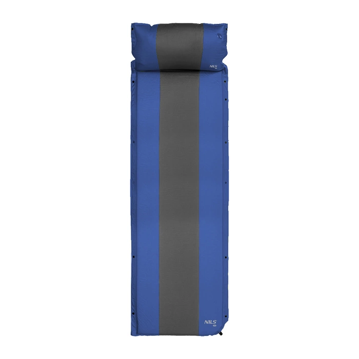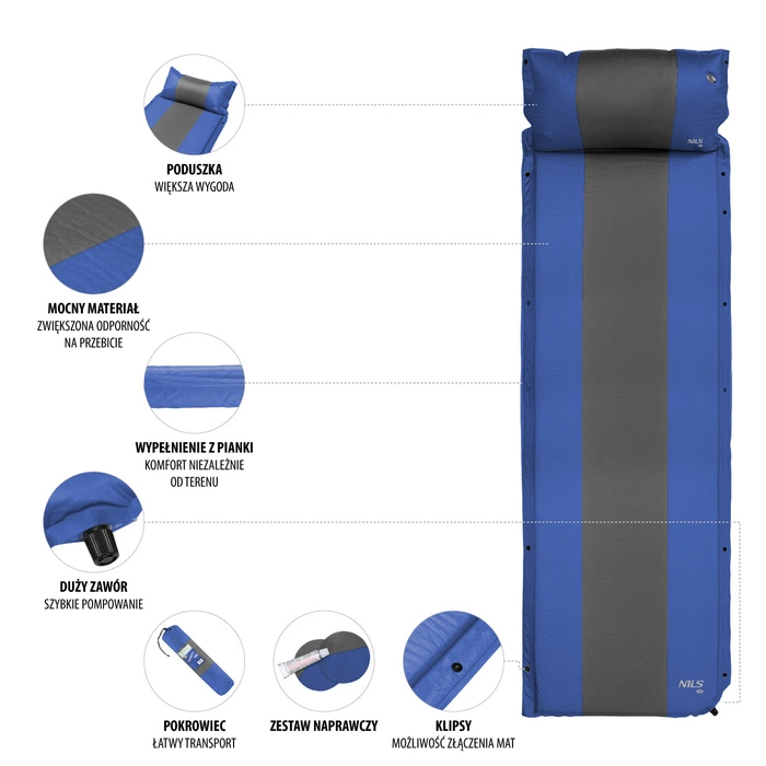 Mata samopompująca z poduszką NC4349 NILS CAMP to wysokiej jakości produkt, który sprawdzi się idealnie na campingu. Produkt wykonany jest z poliestru oraz pianki PU o dużej gęstości, dzięki czemu jest on bardzo trwały oraz wygodny w użytkowaniu. Na jego wyposażeniu znajduje się zestaw naprawczy, który pomoże w naprawieniu ewentualnej usterki. Ponadto produkt oferowany jest z dopasowanym pokrowcem, który chroni przez zabrudzeniem. Mata samopompująca po złożeniu posiada tylko 62 cm długości, dzięki czemu bez problemu można ją przetransportować w samochodzie.
