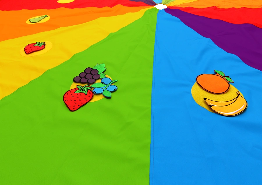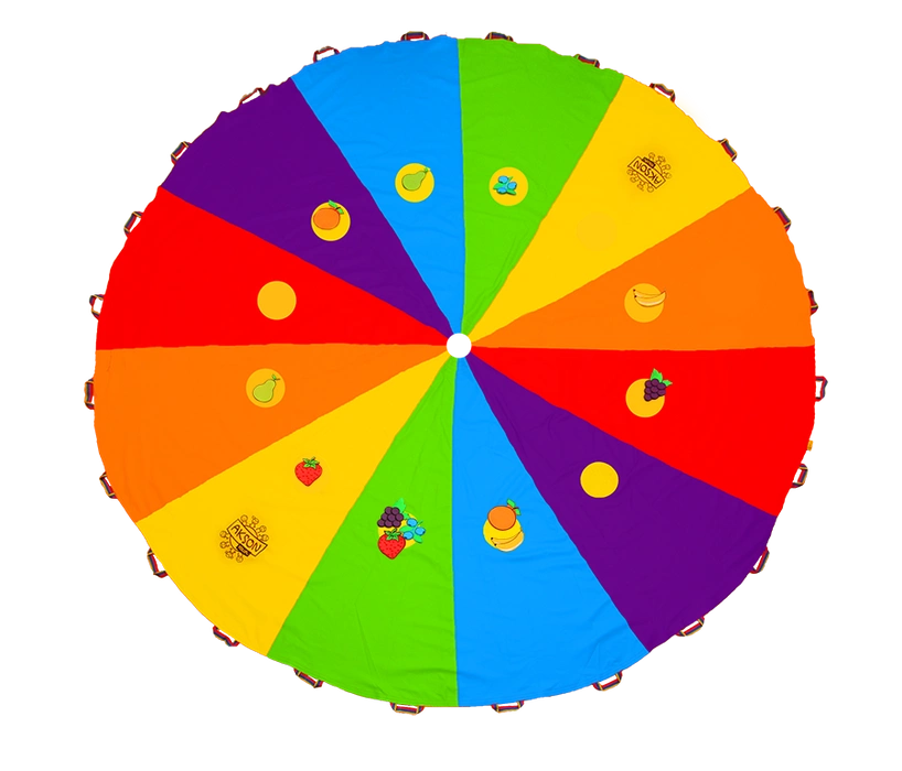 Chusta Edukacyjna AKSON tak jak klasyczna chusta animacyjna składa się z 12 kolorowych klinów, ale dodatkowo na każdym klinie znajduje się rzep w kształcie koła o średnicy 15 cm. Rzepy można wykorzystać w zabawie z chustą przyczepiając do niej dodatkowe elementy.