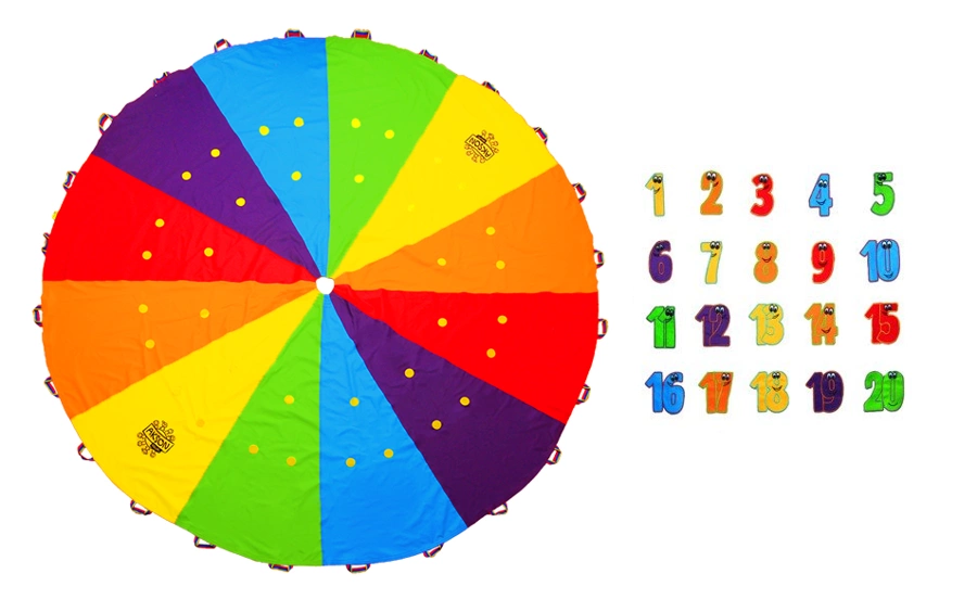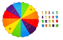 Chusta Edukacyjna AKSON tak jak klasyczna chusta animacyjna składa się z 12 kolorowych klinów, ale dodatkowo na każdym klinie znajdują się 3 rzepy w kształcie kół o średnicy 46mm. Rzepy można wykorzystać w zabawie z chustą przyczepiając do niej dodatkowe elementy.