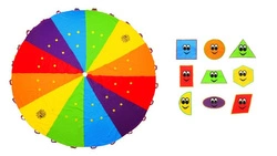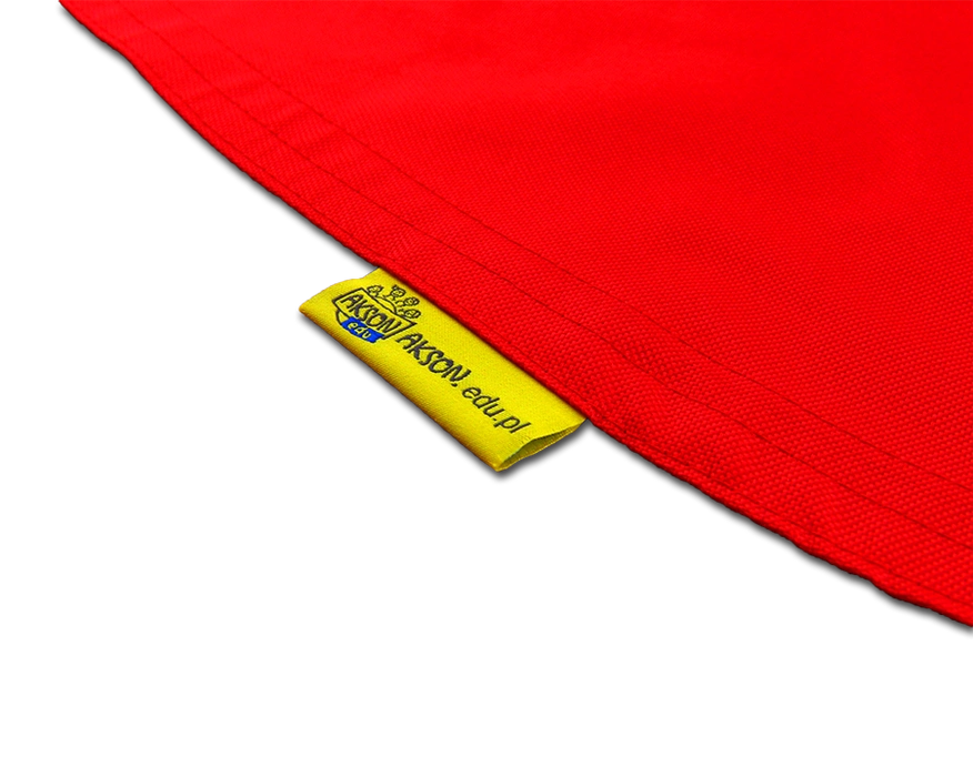 Chusta Edukacyjna AKSON tak jak klasyczna chusta animacyjna składa się z 12 kolorowych klinów, ale dodatkowo na każdym klinie znajdują się 3 rzepy w kształcie kół o średnicy 46mm. Rzepy można wykorzystać w zabawie z chustą przyczepiając do niej dodatkowe elementy.