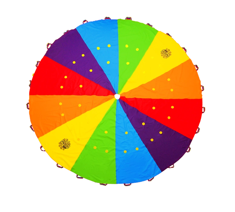 Chusta Edukacyjna AKSON tak jak klasyczna chusta animacyjna składa się z 12 kolorowych klinów, ale dodatkowo na każdym klinie znajdują się 3 rzepy w kształcie kół o średnicy 46mm. Rzepy można wykorzystać w zabawie z chustą przyczepiając do niej dodatkowe elementy.
