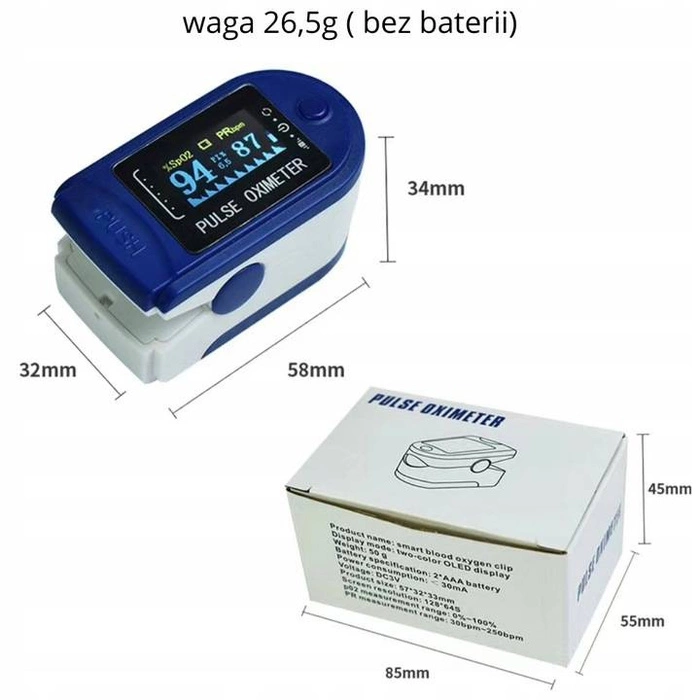 - Zakres pomiaru saturacji SpO2 0%-100% (dokładność ±1%)