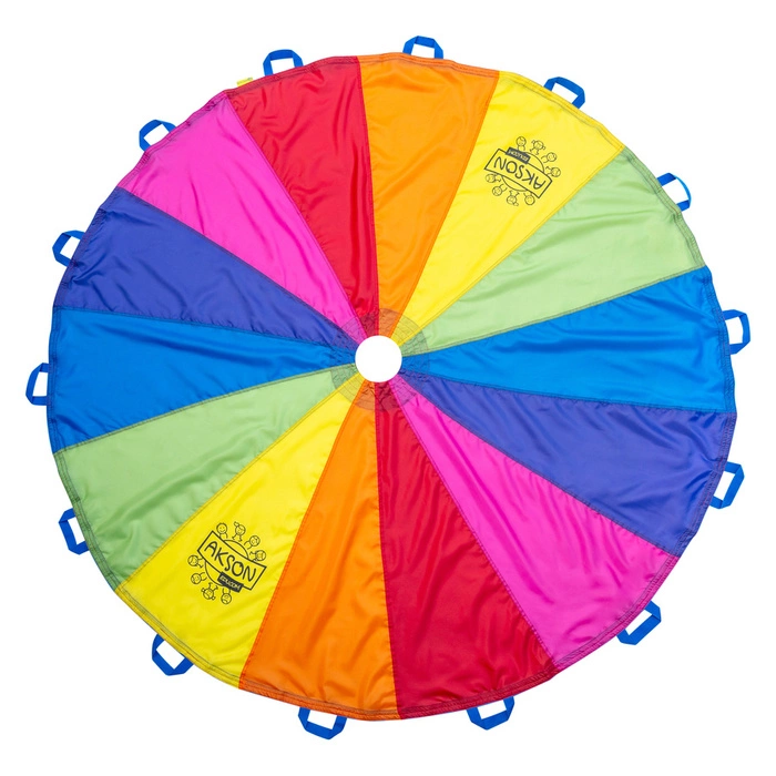 Spadochron animacyjny Akson to tęczowa płachta animacyjna o wymiarach 1.75 średnicy. Wykonany jest z materiału o mniejszej wytrzymałości i większej przezroczystości niż profesjonalna chusta animacyjna Akson. Materiał, z którego wykonane są spadochrony animacyjne jest lżejszy i błyszczący w świetle. Posiada 14 kolorowych trójkątów we wszystkich barwach tęczy (czerwony, poarańczowy,różowy, żółty, zielony, niebieski, fioletowy), otwór w centrum oraz 14 wzmacnianych uchwytów, dzięki czemu umożliwia realizację niemal wszystkich zabaw, które można wykonywać z chustą profesjonalną, rozmaite ich kombinacje i układy, m.in. falowanie, przebieganie pod, wrzucanie piłeczki do środka, podrzucanie kolorowych piłeczek, balonów itp.