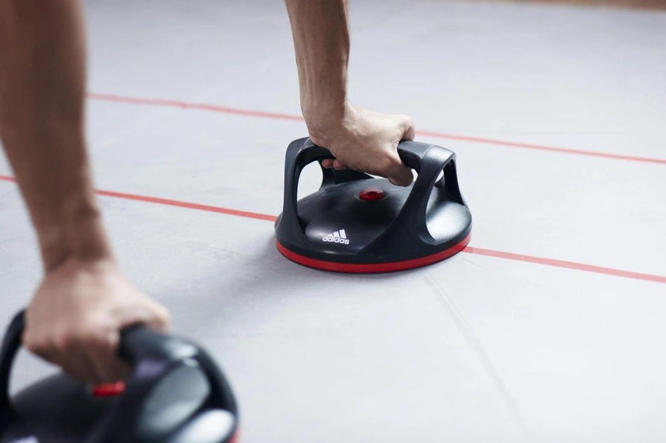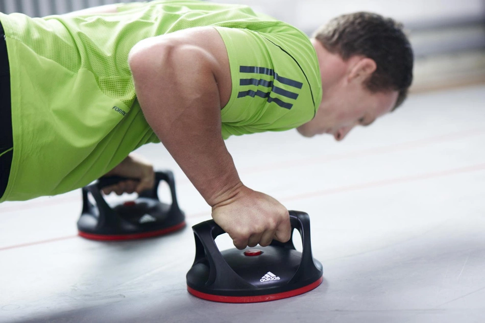 Innowacyjne uchwyty do pompek posiadające unikalny system umożliwiający wykonywanie pompek z rotacją dla zwiększenia intensywności ćwiczeń.