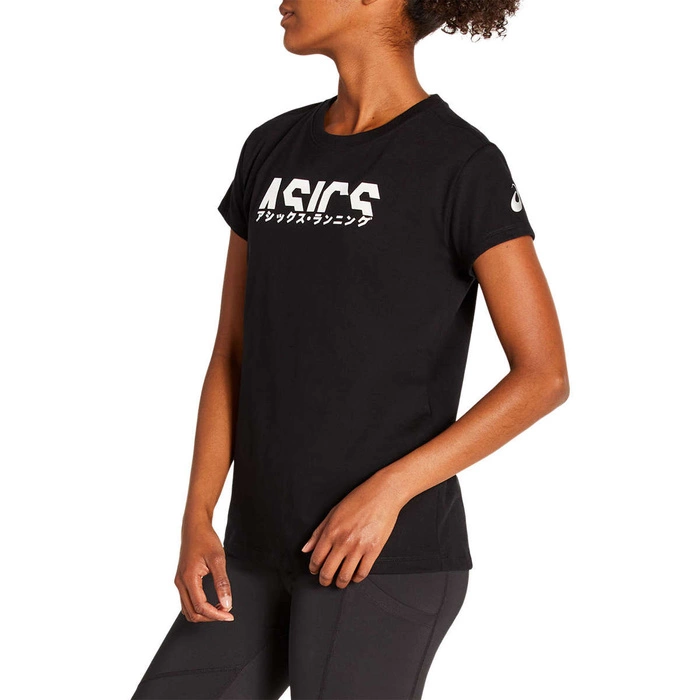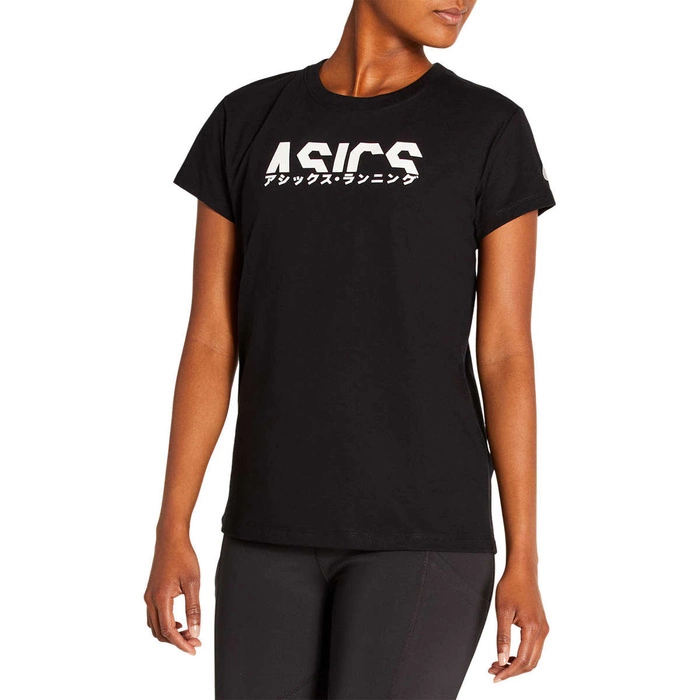 Koszulka posiada krótkie rękawy oraz okrągły dekolt. Na froncie koszulki znajduje się duży, wyraźny napis "ASICS" zapisany w japońskim alfabecie katakana, co nadaje koszulce unikalnego stylu i charakteru.