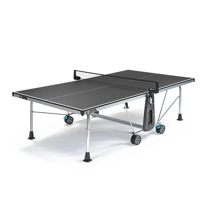 Stół 300 INDOOR marki Cornilleau to idealny sprzęt do użytku domowego. Posiada parametry pozwalające na komfortową i bezpieczną grę. Wyposażony został w zabezpieczenia rogów, regulowaną i składaną siatkę, duże koła z hamulcami oraz kieszenie na piłeczki.