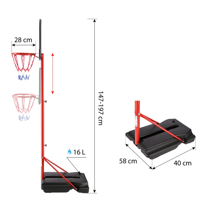 ZDK881A marki NILS to doskonały wybór dla najmłodszych miłośników koszykówki. Kosz został stworzony, aby dostarczyć dzieciom niezapomniane doświadczenia z gry i wznieść ich koszykarskie umiejętności na nowy poziom. ZDK881A to mobilny, wolnostojący kosz, który sprawdzi się w indywidualnych treningach i zabawie wśród dzieci. Regulowana wysokość pozwoli dostosować kosz do wzrostu Twojego dziecka. Dodatkowo w zestawie znajdziemy piłkę wykonaną z miękkiej gumy, która również będzie bezpieczna dla Twojego dziecka. Każdy element konstrukcji kosza jest odporny na warunki atmosferyczne. Precyzyjne wykonanie, stylowy design i wytrzymałość kosza ZDK881A marki NILS sprawią, że każde dziecko poczuje się jak profesjonalny zawodnik koszykówki. Specyfikacja: Wysokość całkowita: 1,47 – 1,97 m Wysokość obręczy: 1,07 – 1,57 m Średnica obręczy: 28 cm Materiał obręczy: Stal Materiał siatki: Polipropylen Materiał tablicy: PVC Wymiary tablicy: 60 x 40 cm Materiał podstawy: PE Wymiary podstawy: 58 x 40 cm Średnica piłki: 13,5 cm Pojemność podstawy: 16 l Wypełnienie podstawy: woda Waga: 5,1 kg Uwagi: Nie przeznaczony do użytku komercyjnego Gwarancja 24 miesiące