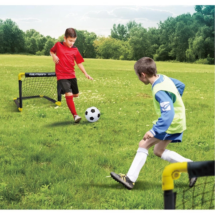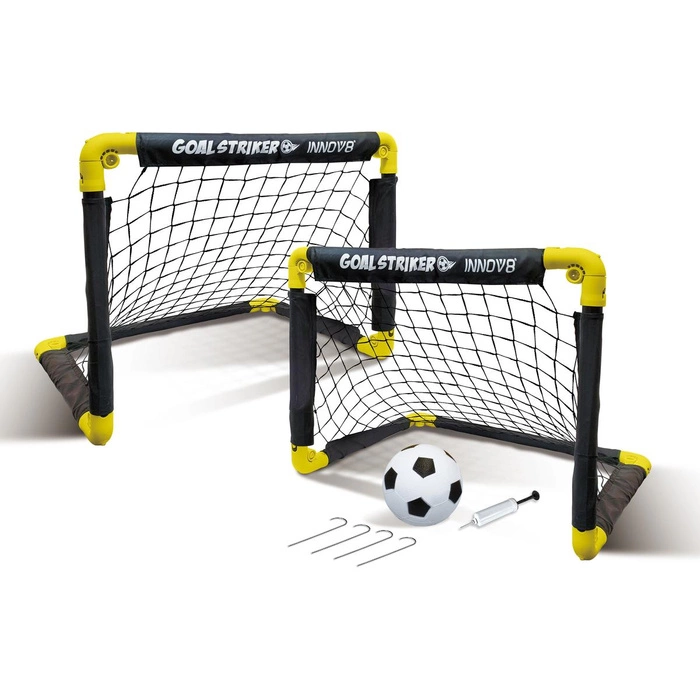- Zestaw zawiera: 2 x składane bramki, 4 śledzie, piłka, pompka