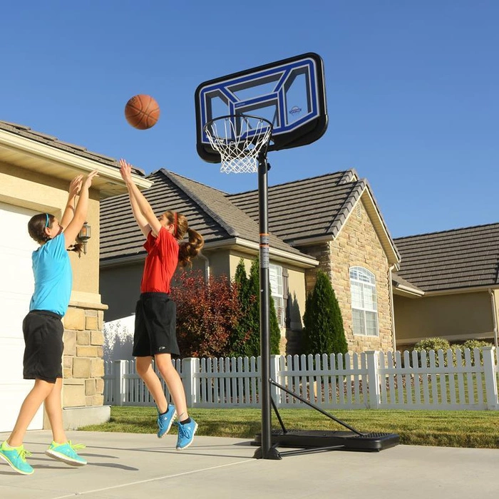 Przenośny stojak do koszykówki posiada 44 calową tablicę wykonaną w technologii Acrylic Fusion™, która gwarantuje wieloletnią trwałość i odporność na uderzenia. Dodatkowo ochrona dolnej krawędzi tablicy oraz teleskopowa regulacji wysokości w zakresie od 228 do 304 cm zapewniają komfortową i bezpieczną grę na każdym poziomie zaawansowania. Całość uzupełnia wytrzymała klasyczna obręcz oraz odporna na warunki atmosferyczne nylonowa siatka i okrągły słup o średnicy 6,9 cm. Rolki transportowe zamontowane w wypełnianej wodą lub piaskiem stabilnej podstawie Streamline o pojemności 45 litrów zapewniają pełną mobilność a zarazem stabilność stojaka