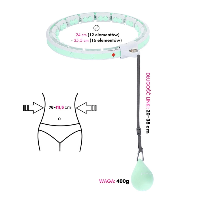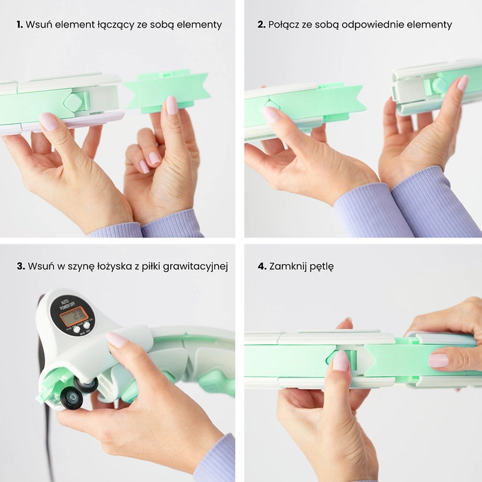 Montaż urządzenia jest niezwykle prosty – wystarczy połączyć odpowiednią liczbę segmentów za pomocą klipsów, dopasować długość paska i można rozpocząć trening. Kompaktowe wymiary (wysokość 21 cm, szerokość 42,5 cm, głębokość 10,5 cm) sprawiają, że hula hop zmieści się w każdej szafie lub torbie podróżnej.
