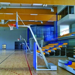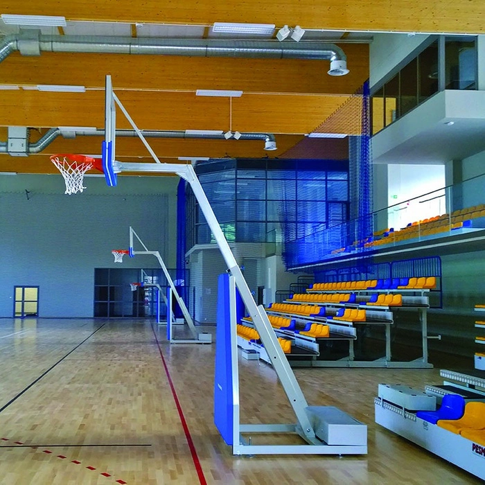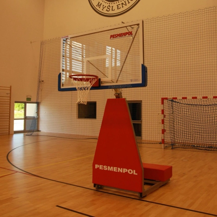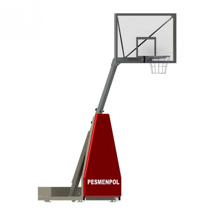Konstrukcja przejezdna do koszykówki o wysięgu 125 cm, przeznaczona do tablic o wymiarach 90x120 cm lub 105x180 cm, wyposażona w płynną regulację wysokości tablicy w zakresie 200 – 260 – 305 cm za pomocą mechanizmu śrubowego. Posiada osłony bezpieczeństwa oraz kółka obrotowe , obciążenia walizkowe 8 szt x 30 kg z możliwością wyjęcia. Całkowita waga: 420 kg.