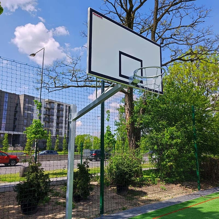Konstrukcja do koszykówki jednosłupowa z tablicą o wymiarach 105x180 cm lub 90x120 cm, wysięg 1,2 - 1,65 m, instalowana na stałe w podłożu, przeznaczona do gry na otwartej przestrzeni (place zabaw, boiska szkolne).