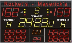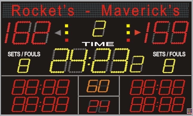 Podstawowa tablica wyników  o wymiarach 150 x 120 x 7 cm. Tablica z licznikami kar, czasem trenera, panelem tekstowym i zegarem czasu akcji przeznaczona do obsługi koszykówki, siatkówki, piłki ręcznej, piłki nożnej, badmintona i innych. Dobra czytelność do 60 m każdego punktu hali