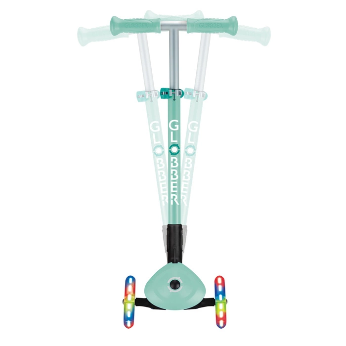 PRIMO FOLDABLE LIGHTS jest wyposażona w opatentowany przez firmę Globber system blokady kierownicy, który blokuje przednie koła hulajnogi tak, aby poruszały się wyłącznie do przodu i do tyłu, dzięki czemu dzieci mogą zyskać pewność siebie podczas jazdy na hulajnodze, jednocześnie ćwicząc umiejętności utrzymywania równowagi. Aby przejść w tryb pełnej jazdy i umożliwić jazdę z przechyleniem kierownicy, po prostu zwolnij przycisk blokady kierownicy znajdujący się na podstawie podestu do hulajnogi.