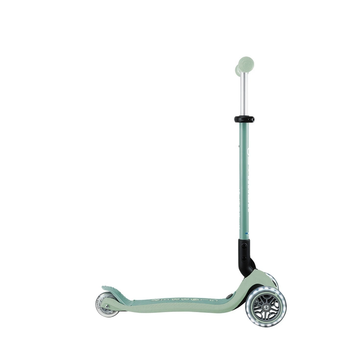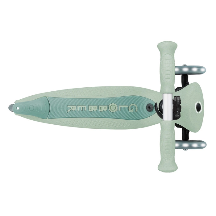 GO • UP Active Lights ECOLOGIC jest wyposażony w opatentowany przez firmę Globber system blokowania kierownicy, który blokuje przednie koła hulajnogi, aby poruszać się tylko do przodu i do tyłu, dzięki czemu dzieci zyskują pewność podczas jazdy na hulajnodze, jednocześnie ćwicząc umiejętności utrzymywania równowagi.