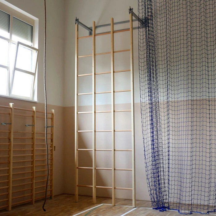 Wykonana z drewna, malowana lakierem bezbarwnym, mocowana do ściany. Krata z trzema polami ćwiczebnymi. Wysokość: 5 m.