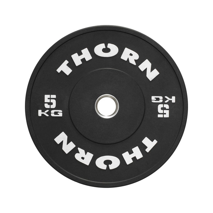 THORN FIT Training bumper plates Założeniem projektowym talerzy THORN FIT Training Bumper Plates o wadze 5 kg było stworzenie jak najwęższego talerza, który będzie można dokładać do sztangi z nakładem w celu podnoszenia rekordów. W związku z tym talerze nie powinny być zakładane na sztangę jako jedyne obciążenie i używane do rzucania. Jeżeli dopiero zaczynacie przygodę z treningiem typu crossfit i potrzebujecie sztangi z nakładem o niskiej wadze, polecamy talerze Enduro, które zostały zaprojektowane właśnie do takiego użytkowania. Innym rozwiązaniem jest wybranie sztangi treningowej o wadze 10kg. Talerze THORN FIT Training Bumpers zostały zaprojektowane tak aby w jak najmniejszym stopniu odbijały się od podłoża. Są jednocześnie wytrzymałe i zapewniają doskonały stosunek jakości do ceny przez co mogą być użytkowane zarówno w domu jak i komercyjnej przestrzeni treningowej. Te funkcjonalne talerze są wykonane z wysokiej jakości gumy i wyposażone w stalowy pierścień ułatwiający zakładanie i zdejmowanie talerzy ze sztangi podczas treningu. Talerze Training Bumpers zostały również wyposażone w wypukłe znaczniki oraz logo pomalowane na kolor odpowiadający poszczególnej wadze. Specjalne fazowanie na krawędzi ułatwia zdejmowanie talerzy ze sztangi i podnoszenie ich z podłogi. Każdy Training Bumper ma średnicę zgodną ze standardami IWF 450mm, ale jest znacznie cieńszy niż talerze Enduro, dzięki czemu na gryf możemy nałożyć większy ciężar. Dodatkowo, talerze Training Bumper Plates charakteryzują się sztywnością 88 mierzoną na skali durometru co oznacza, że w porównaniu z talerzami Enduro w znacznie mniejszym stopniu odbijają się od podłoża.