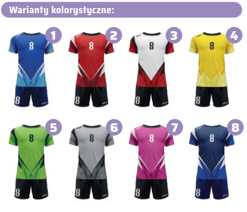 Produkt wykonywany w technologii sublimacji. 3 powtarzające się nadruki (np.herb, nazwa klubu, logo sponsora) numer na koszulce ( przód , tył ) oraz numer na spodenkach ( przód ) zawarte w cenie produktu.