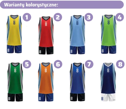 Komplet koszykarski, przeznaczony na profesjonalne zawody sportowe. Zastosowane technologie oraz materiały gwarantują najwyższą jakość w produkcji odzieży sportowej. Koszulka sublimowana - spodenki nie.