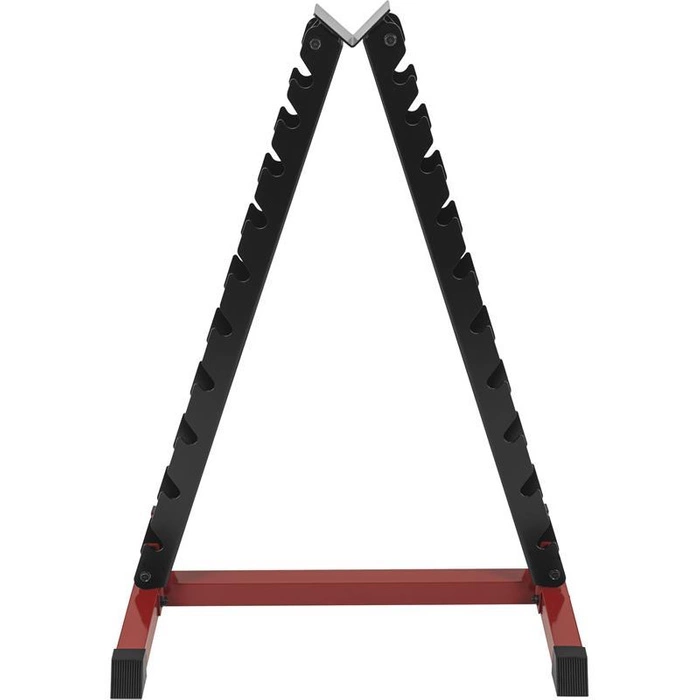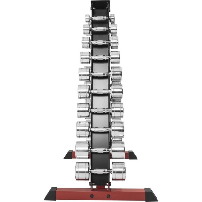 Stojak wykonany jest ze starannością o każdy detal na miarę profesjonalnie wyposażonej siłowni. Konstrukcja jest bardzo solidna i zaprojektowana tak, aby zajmowała jak najmniej miejsca, jednocześnie utrzymując duży ciężar sprzętu sportowego. Uwaga! Hantle przedstawione na zdjęciu nie są częścią zestawu.
