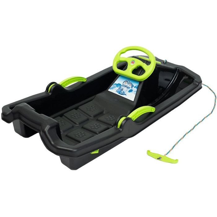 Te sanki to nowoczesny gadżet do zabawy na śniegu, wyposażone w kierownicę, która umożliwia skręcanie w lewo lub prawo. Dzięki niej dziecko może wybrać dowolny kierunek jazdy i omijać przeszkody na trasie .